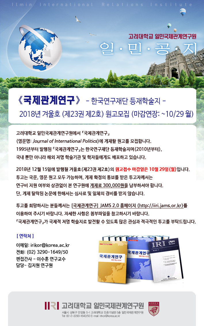 고려대학교 일민국제관계연구원에서 『국제관계연구』(영문명: Journal of International Politics)에 게재할 원고를 모집합니다. 1995년부터 발행된 『국제관계연구』는 한국연구재단 등재학술지이며(2010년부터), 국내 뿐만 아니라 해외 저명 학술기관 및 학자들에게도 배포되고 있습니다. 『국제관계연구』가 국제저명 학술지로 발전할 수 있도록 많은 관심과 적극적인 논문 투고를 부탁드립니다.
